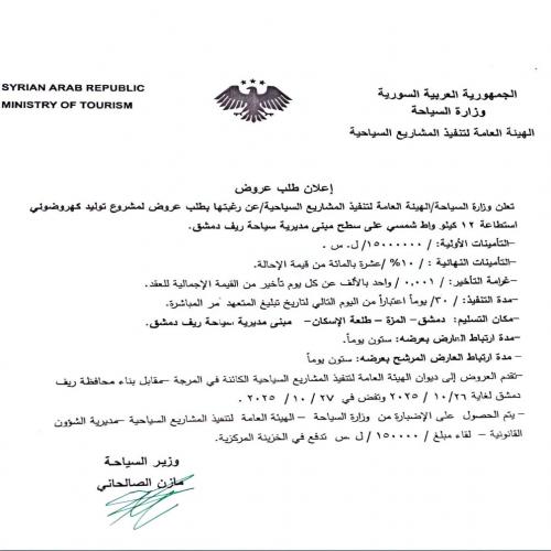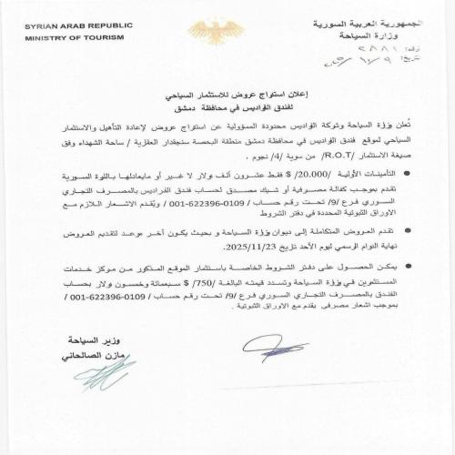 تعلن وزارة السياحة وشركة الفراديس محدودة المسؤولية عن استدراج عروض لإعادة تأهيل واستثمار فندق الفراديس بدمشق وفق صيغة R.O.T من سوية /4/ نجوم، ويمكن الحصول على دفتر الشروط من مركز خدمات المستثمرين في وزارة السياحة، حيث تقدم العروض المتكاملة لاستثماره إلى ديوان الوزارة لغاية نهاية الدوام الرسمي من يوم الأحد 23/11/2025.